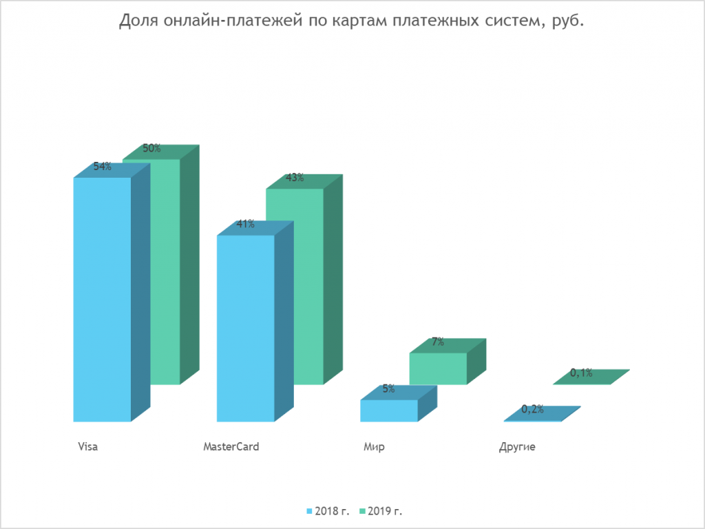 Количество транзакций по картам «Мир» при оплате покупок в интернете за прошедший год удвоилось, благодаря чему доля национальной платежной системы достигла 7% от общего объема онлайн-платежей в рублях. Напомним, что два года назад доля онлайн-платежей по картам «Мир» не превышала 1%. Продолжает сокращаться относительный объем онлайн-платежей по картам Visa в рублях – на 4 п.п. за 2019 год (54% в 2018 году и 50% в 2019).