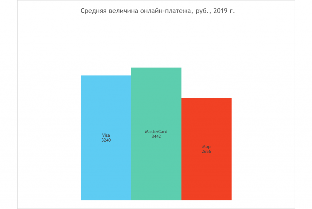Средняя величина одного онлайн-платежа по картам всех платежных систем в 2019 году практически не изменилась по сравнению с предыдущим годом. Владельцы карт «Мир» в среднем совершают платеж на 2656 рублей, Visa – 3240 рублей, MasterCard – 3442 рубля.