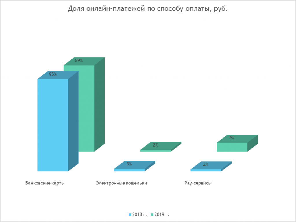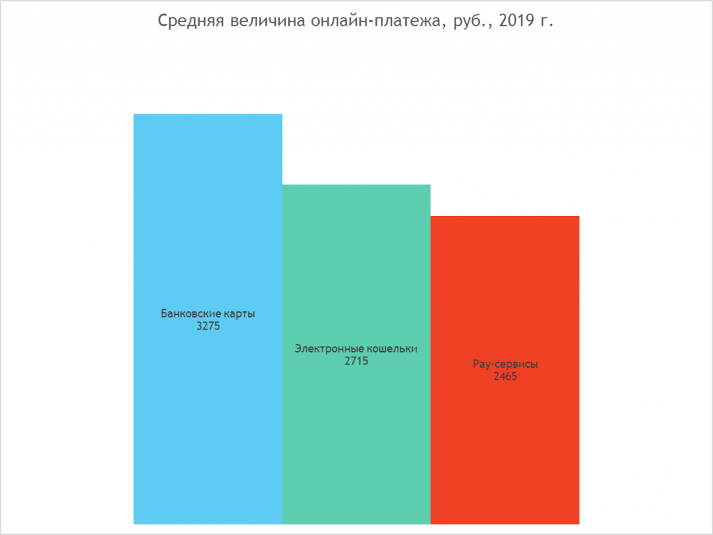 Самый крупный средний онлайн-платеж по-прежнему остается за банковской картой – в 2019 году он составил 3275 рублей. При помощи pay-сервисов тратили за один платеж 2465 рублей. Тем не менее примечательно, что средняя величина одного онлайн-платежа по pay-сервисам выросла за минувший год на 14%, тогда как по банковским картам – на 2%. Очевидно, потенциал этого роста еще не исчерпан, т.к. в целом pay-сервисами пользуется наиболее продвинутая аудитория, владеющая смартфонами с биометрическими технологиями аутентификации.