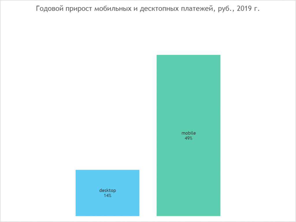 Платежи продолжают «перетекать» в мобильный канал, и это наглядно видно по динамике прироста объема платежей: за прошедший год объем онлайн-платежей, совершенных с мобильных устройств, вырос на 49% в рублях, тогда как аналогичный показатель у десктопных платежей – на 14%.