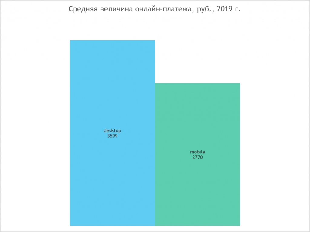 Средний онлайн-платеж с мобильных устройств по-прежнему меньше, чем с десктопа – 2770 и 3599 рублей соответственно. За год они практически не изменились (в пределах 1-2%).