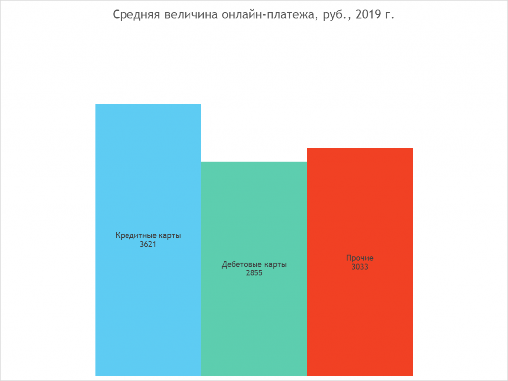 Средний размер одного онлайн-платежа по кредитным картам выше, чем по дебетовым – 3621 рубль против 2855 рублей. За прошедший год это соотношение также не претерпело заметных изменений.