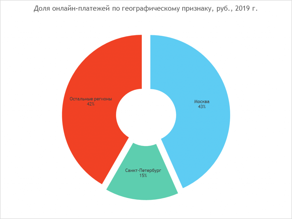 Москва традиционно показывает наибольший результат по объему онлайн-платежей – за 2019 год он составил 43% в рублях. Это больше, чем все остальные регионы России вместе за исключением Санкт-Петербурга – на него приходится 15%, на остальные регионы 42%.