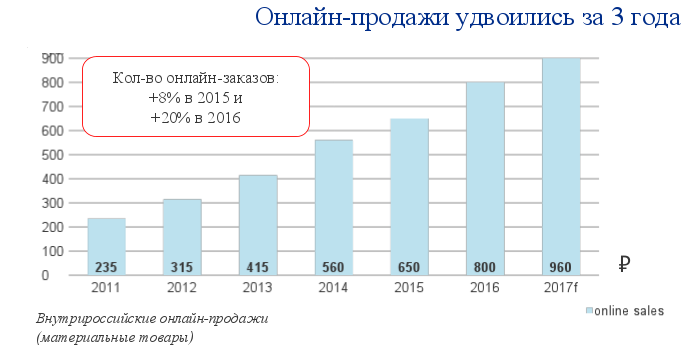 Данные исследовательского агентства Data Insight показывают, что российский eCommerce постоянно растет. Как рассказал один из основателей агентства Федор Вирин на итоговом завтраке Upgrade, в 2017 году продажи в отрасли составят 960 млрд рублей без учета доставки готовой еды, кроссбордера и цифрового контента.