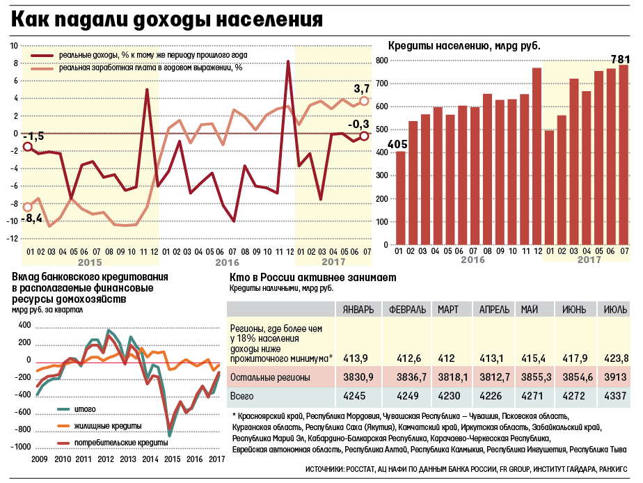 В Минэкономразвития, в то же время, отмечают постепенный рост доходов людей. Эксперты говорят, что это, впрочем, связано не с повышением зарплат, а с укреплением курса рубля и тем, что россияне влезают в кредиты. Как отмечается в "Мониторинге экономической ситуации в России" РАНХиГС, на 23% выросло потребительское кредитование. По данным Национального бюро кредитных историй, за восемь месяцев выдача таких займов увеличилась на 27%.