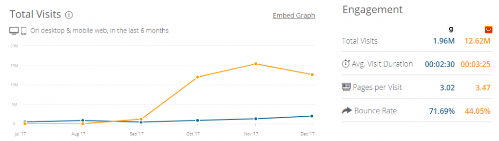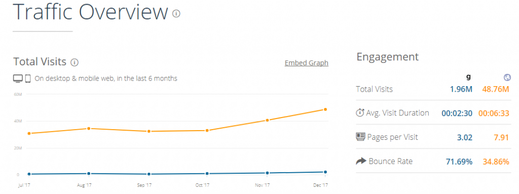 - Показатель отказов сайта goods.ru, согласно Similarweb, составляет чуть больше 71%.