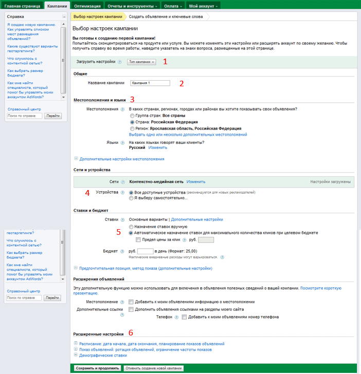 Попадаем на страницу, где слева видим надпись "Создать компанию". Компания это та "программа", по которой и будет продвигаться ваш интернет магазин. Создаем и попадаем на такую страницу: