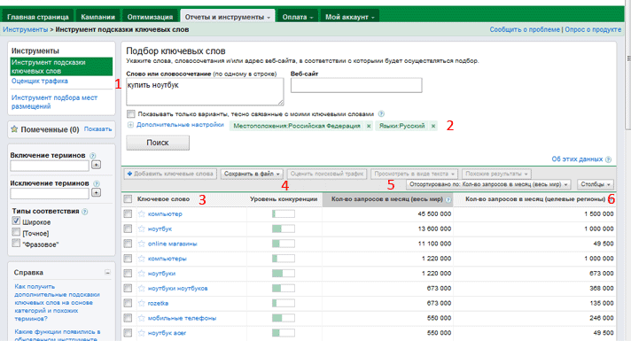 Дополнительные инструменты Google AdWords. Инструмент подсказки ключевых слов. Находится в меню Отчеты и инструменты. Этот сервис ищет ключевые слова и показывает количество запросов по ним, а также уровень конкуренции.
