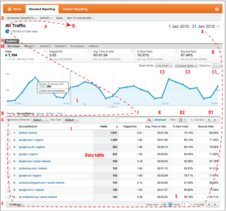 «Взгляд перемещается по часовой стрелке — начиная с селектора даты в верхнем правом углу, затем смещаясь вниз через таблицу данных, опции нижнего колонтитула, сворачивая к селектору измерений и фильтру таблицы, потом поднимаясь вверх через диаграмму данных и вкладки меню отчета, после чего пробегает расширенные сегменты, параметры экспорта и инструментальную панель. Этот путь приближенно соответствует степени подробности данных. То есть, чем дальше вы продвигаетесь в исследовании, тем больше подробностей открывается».