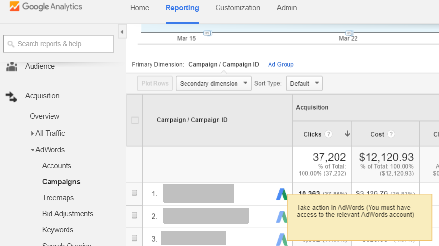 1. Глубокие ссылки на AdWords в отчётах GA о кампаниях AdWords: рядом с каждой кампанией в GA появятся логотипы AdWords. Теперь пользователю не придётся открывать сайт AdWords, чтобы найти определенную рекламную кампанию: для быстрого перехода в кампании AdWords, нужно кликнуть на логотип.