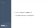 Как правило, поиск по сайту одна из самых ресурсоемких задач. Сейчас я не буду рассматривать варианты оптимизации поиска, потому что это не является задачей нашего вебинара.