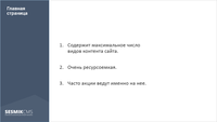 Особенность главной страницы такова, что она как правило содержит максимальное число возможностей сайта: витрина акций, какие-то товары (новинки), анонсы блога, новости, какие-то специальные предложения.