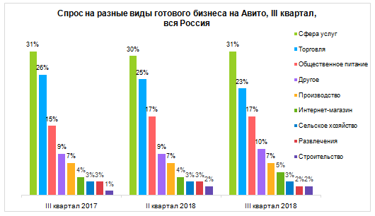 При этом спроса на готовые интернет-магазины почти нет. Ими интересуются всего 5% от общего числа людей, готовых купить какой-нибудь готовый бизнес. Самыми же востребованными в России остаются компании из сферы услуг и офлайн-торговли. На них на данный момент приходится 31% и 23% спроса. Уточним, что в Авито используют свой способ подсчета спроса по "запрошенным контактам". Это переход по ссылке "показать телефон" или "написать сообщение".