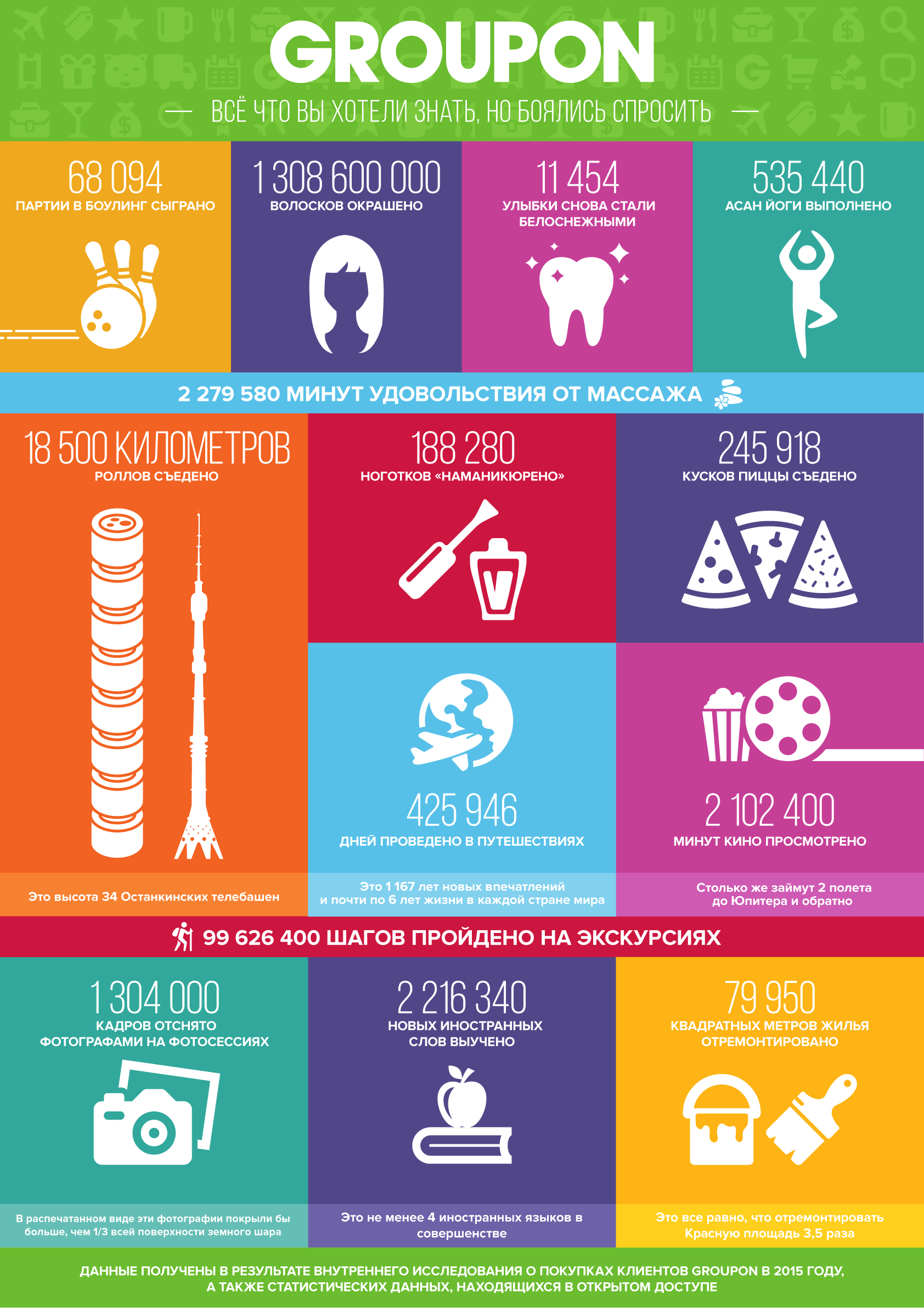Скидочный сервис Groupon проанализировал покупки своих пользователей за прошлый год. Выяснилось много интересного. В частности, за прошлый год пользователи Groupon: