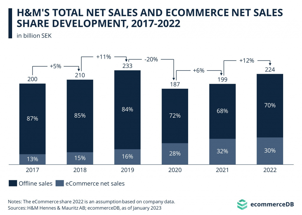 Из-за карантина по всей Европе в 2020 году общий объем продаж H&M значительно упал (с 233 до 187 млрд евро). К 2022 году компания смогла почти полностью восстановить объем продаж.