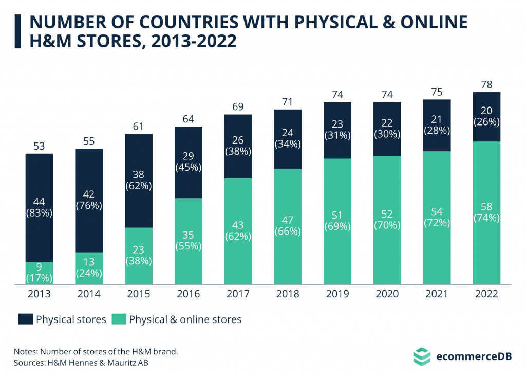 Производитель расширяет свое присутствие и в интернет-торговле по всему миру. Согласно недавно опубликованному годовому отчету компании, сейчас 74% стран, где есть физические магазины H&M, также доступны и интернет-магазины бренда.