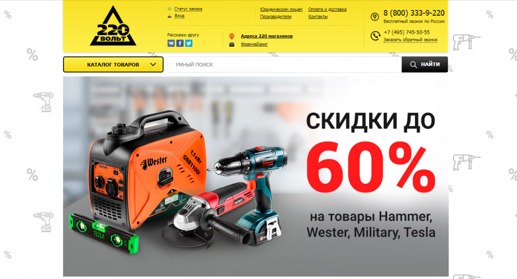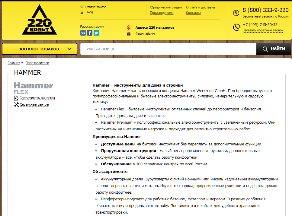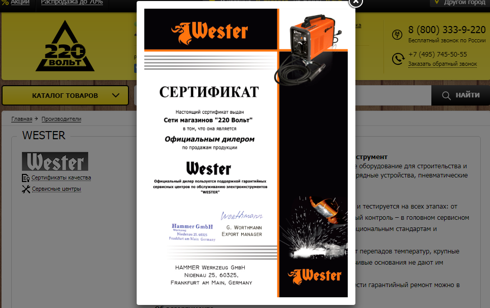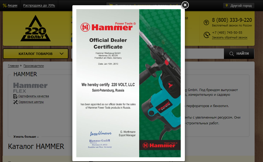 Товары марок Hammer, Wester и Military уже довольно известны в нашей стране, причем именно благодаря компании "220 вольт". Сейчас, например, на сайте можно найти несколько сотен товаров бренда Hammer: от автокосметики до лопат.Как следует из сертификатов, представленных на сайте "220 вольт", компания является официальным дилером продукции Hammer на российском рынке еще с 10 января 2013 года.