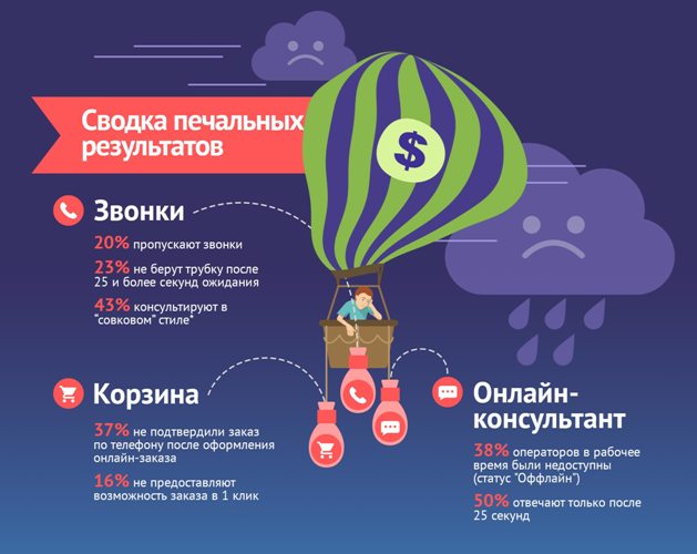 Но самая глобальная проблема не касается скорости ответов и встречается даже там, где трубку снимают за долю секунды. Речь о плохом обслуживании. «Совковый» подход отмечен у 43% магазинов. Это значит, что менеджеры даже не удосуживаются представиться и назвать компанию.