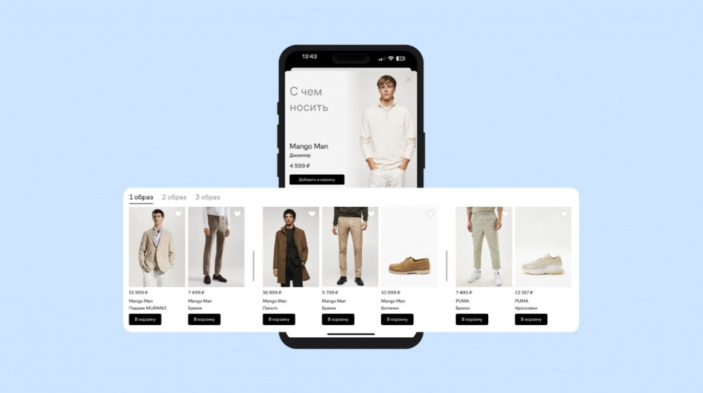 Чтобы запустить услугу на смартфоне, достаточно во время онлайн-шопинга нажать на специальную подсказку "С чем носить", которая всплывает в карточке товара.