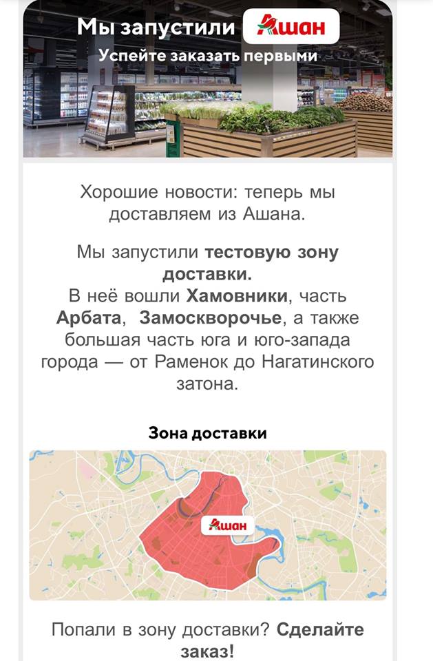 Сервис Instamart сообщил о запуске доставки из магазинов "Ашан". Пока что услуга осуществляется в тестовом режиме и доступна только в нескольких районах Москвы.