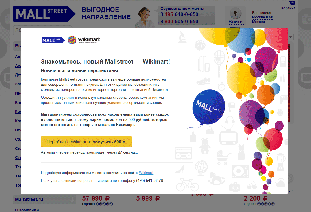 Главная страница интернет-магазина Mallstreet.ru сообщает об этом приветcтвенной заглушкой с автоматическим редиректом на сайт Wikimart.ru