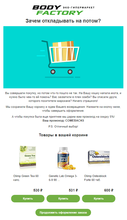 Чаще всего причиной для этого становится отсутствие денег для покупки. И письмо по сценарию «Брошенная корзина» — хороший способ ненавязчиво напомнить о недооформленном заказе и дожать до сделки. А заодно и продать вдогонку что-нибудь еще.