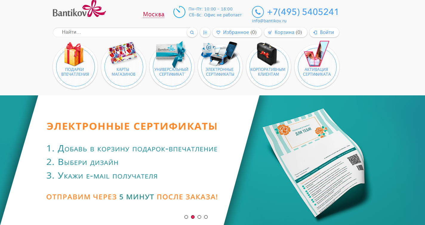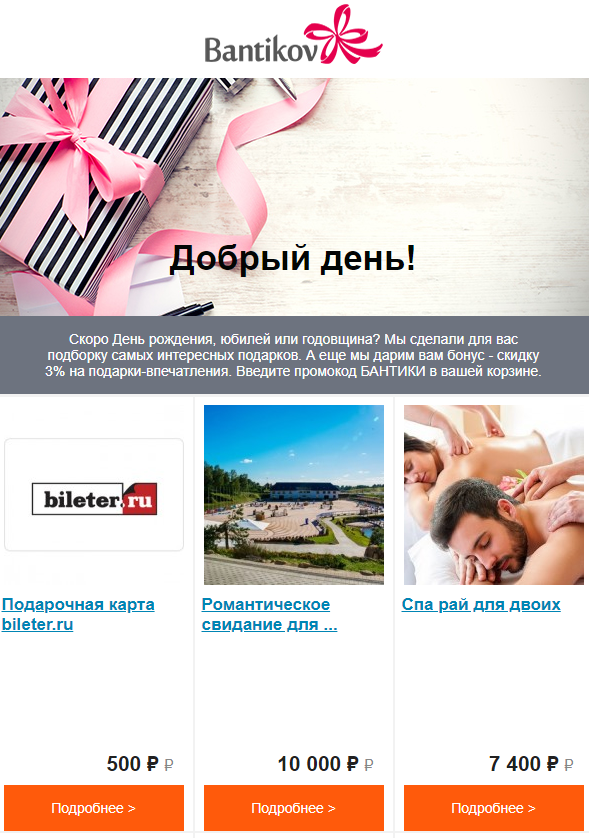 Магазин подарочных карт Bantikov.ru регулярно отправляет подборки с новинками тем покупателям, кто давно не появлялся.