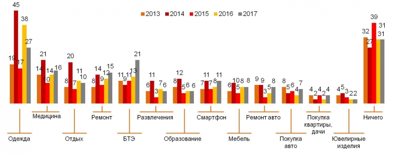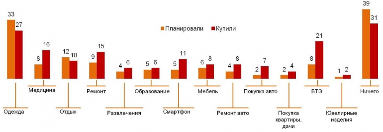 В ходе опроса, проведенного в апреле 2017 года, выяснилось, что по сравнению с прошлым годом наблюдается устойчивый рост по большей части статей расходов, особенно в покупках бытовой техники и электроники, смартфонов и планшетов, машин. Существенно сократилась лишь доля купивших одежду и обувь - с 38% до 27%. Интересно, что именно в этом сегменте россияне активно экономят. Планировали покупки 33%, а реально купили 27%.