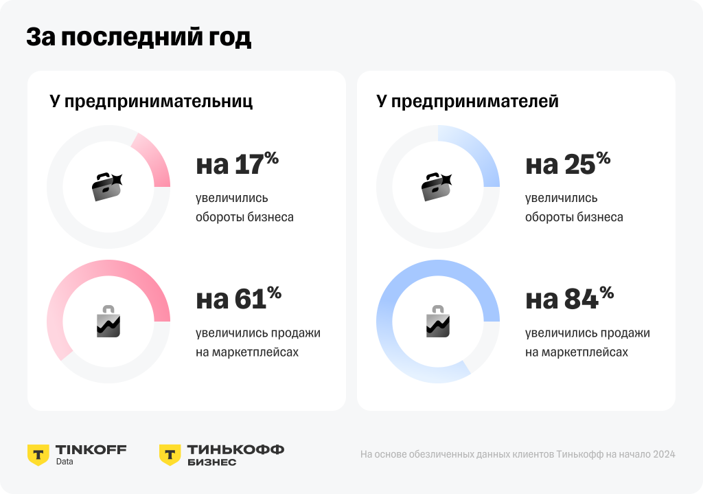 За прошедший год женщины увеличили обороты бизнеса на 17%. При этом предпринимательницы на маркетплейсах показали более впечатляющие результаты - их бизнес в среднем вырос на 61%. Мужчины-предприниматели опередили женщин: оборот их бизнеса увеличился на 25%, а на маркетплейсах - на 84%.