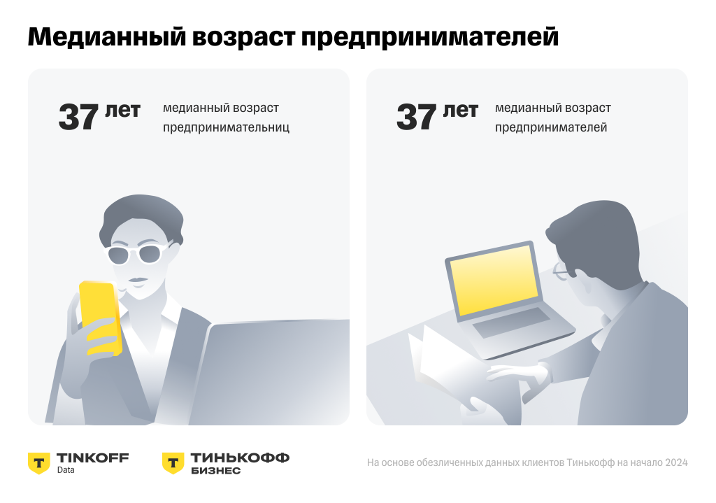 Медианный возраст как у женщин, так и у мужчин в российском бизнесе составляет 37 лет.