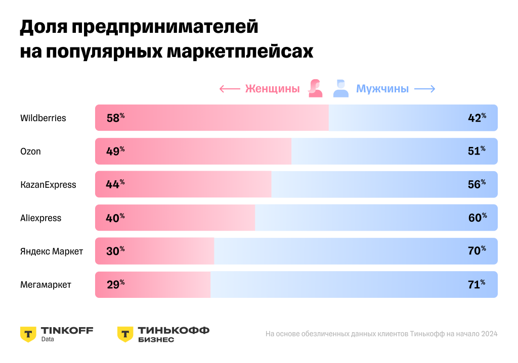 Доля женщин-селлеров на маркетплейсах составляет 54% против 46% мужчин. Самый популярный маркетплейс у предпринимательниц - Wildberries: 58% продавцов на этой площадке - женщины. Следом за ним идет Ozon: на этой площадке женщин и мужчин почти поровну - 49% и 51% соответственно.
