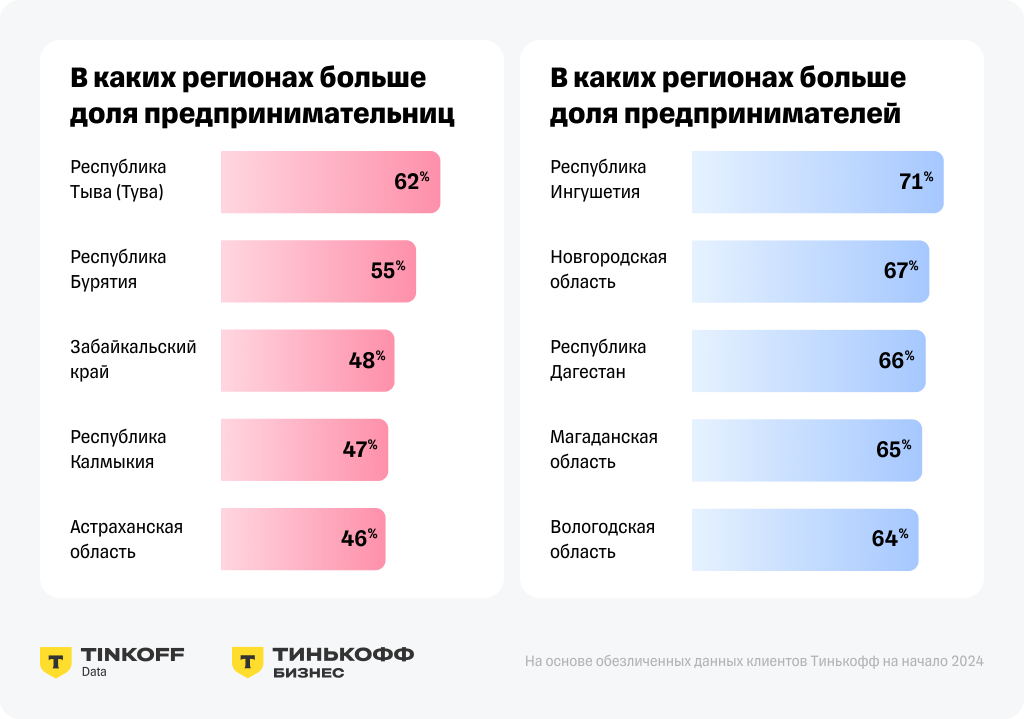 Если говорить о целых регионах, только в Тыве и Бурятии женщины более активны в бизнесе, чем мужчины. В топ-5 регионов по количеству предпринимательниц вошли: