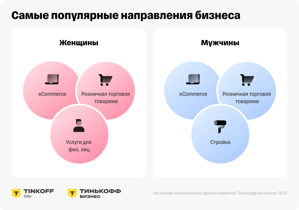 Топ-3 самых популярных направлений бизнеса у предпринимательниц не изменился за год - это e-commerce, розничная торговля и услуги для физических лиц. Мужчины продолжают активнее всего развивать бизнес в электронной коммерции и розничной торговле и строительстве.