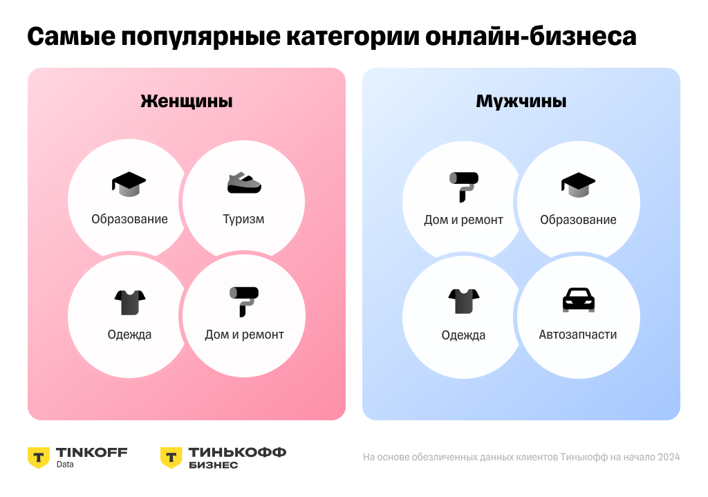 Самые популярные категории офлайн-бизнеса у женщин - продуктовые магазины, кафе и рестораны, салоны красоты, магазины одежды. Мужчины же чаще всего открывают свое дело в сферах общественного питания, магазинов для дома и ремонта, продуктовых магазинов и магазинов автозапчастей.