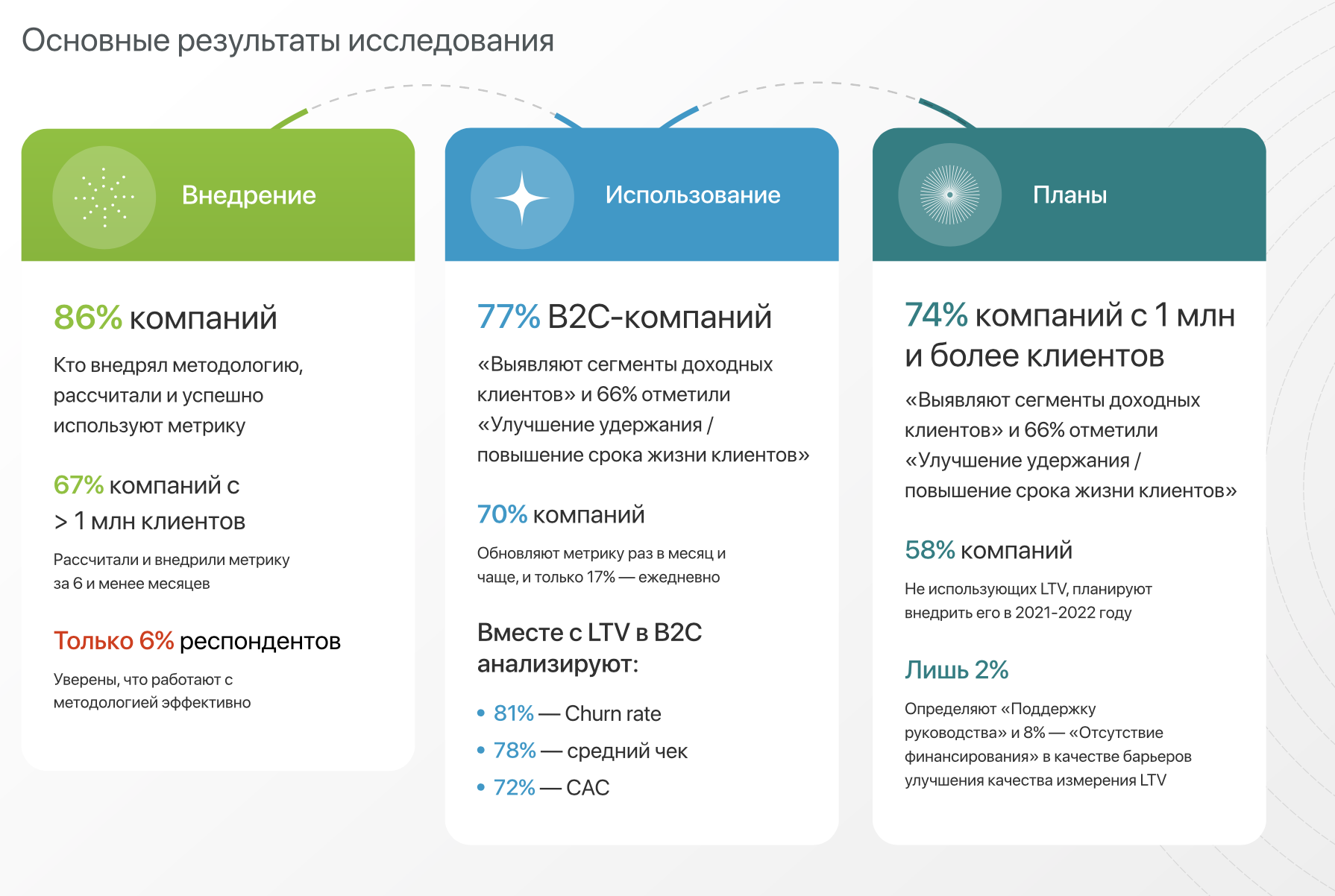 Изучая методы и периодичность расчета LTV, эксперты установили, что из тех, кто пользуется метрикой в России, 42% компаний обновляют ее раз в месяц, 27% — раз в неделю и 17% — ежедневно.