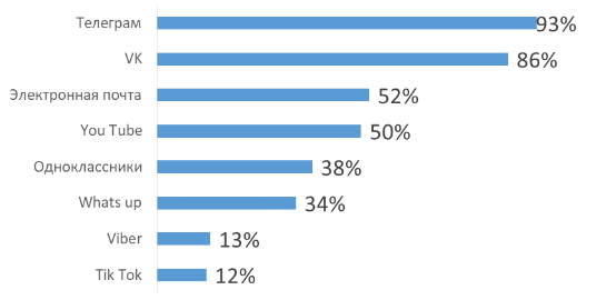 93% компаний используют для взаимодействия с покупателями мессенджер Телеграмм, 86% - социальную сеть ВКонтакте, 52% электронную почту, 50% канал Youtube, 38% взаимодействуют с покупателями в "Одноклассниках", 34% в мессенджере WhatsApp, 13% в Viber и 12% используют TikTok.