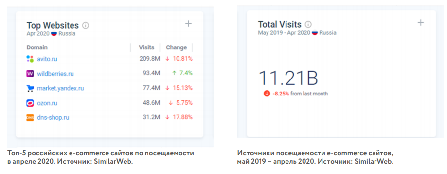 Общая посещаемость российских eСommerce сайтов составляет около миллиарда визитов в месяц. При этом визиты с десктопных устройств обгоняют визиты с мобильных — 55,26% против 44,74%.