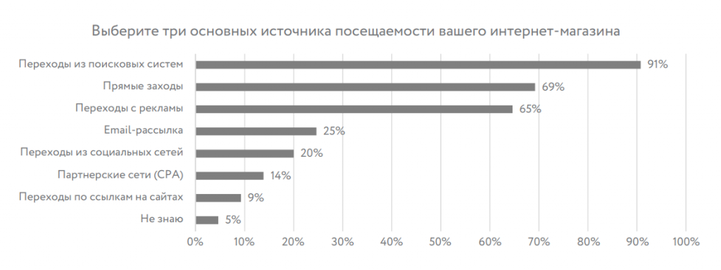 Топ-3 источника посещаемости по мнению опрошенных: переходы из поисковых систем (91%), прямые заходы (69%), переходы с рекламы (65%).
