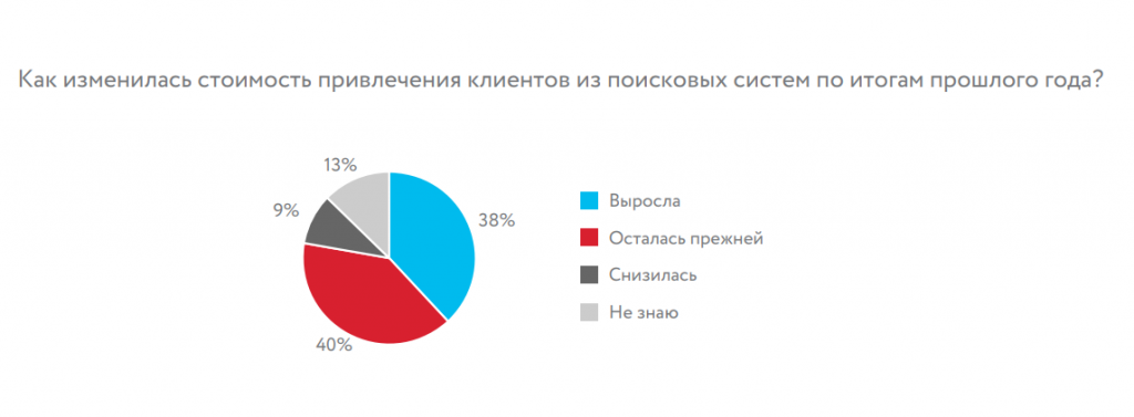 Если говорить о стоимости привлечения клиента из поисковых систем, то для 47% опрошенных она ниже, чем из других каналов интернет-маркетинга. У 20% респондентов стоимость клиента из поиска сопоставима с другими каналами маркетинга.