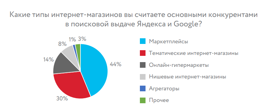 Среди онлайн-ритейлеров среднего размера больше тех, кто размещает предложения в маркетплейсах, чем среди крупных и мелких. При этом маркетплейсы считают своим основным конкурентом в поиске лишь 44% опрошенных. А вот онлайн-гипермаркеты, которые тоже часто высоко ранжируются в поиске, в качестве конкурентов воспринимают лишь 14% участников. Оставшиеся 30% респондентов видят основными конкурентами другие интернет-магазины.