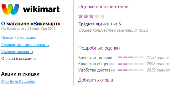 Например, в гипермаркете Wikimart есть целый раздел отзывов. Нужно сказать, что средняя оценка пользователей магазину – всего 3 из 5. Несмотря на это, он показывает пользователям, что магазин ничего не скрывает, что он готов дать слово клиентам и при необходимости решить возникшие проблемы «не отходя от кассы». Негативно или позитивно воспримут пользователи эту пресловутую тройку?