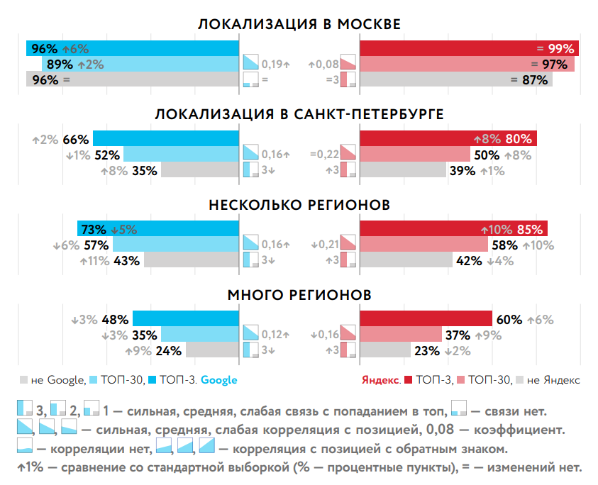 Техническая продвинутость: продолжает расти. Протокол https - у 94-96% сайтов в топе, адаптивная верстка - около 90%, микроразметка - 80%. Доля текста в HTML-коде упала до 5-6%.