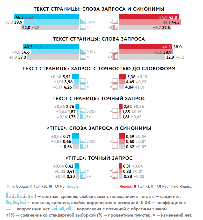 Текстовые параметры: сокращается размер SEO-текста. Чем дальше от точного запроса, тем сильнее может быть параметр. Вхождения отдельных слов запроса важнее, чем вхождения всех слов рядом, и тем более — чем точный запрос. Эксперты называют это "принципом антибуквализма".
