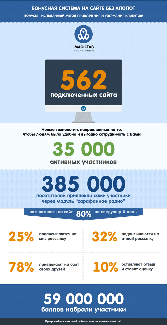 Мы провели опрос 10 тысяч пользователей, которые копят баллы через виджет Magictab на различных сайтах и, как мы ожидали, все высказали положительное отношение к такой системе получения бонусов. Такой способ удобен для посетителей сайта, он мотивирует совершать полезные для продвижения сайта действия и превращать посетителей сайта в постоянных клиентов. Через виджет Magictab в 2013 году авторизовалось 35 000 посетителей и в среднем каждый посетитель привел на сайт 10 своих друзей и знакомых.- 80% посетителей возвращаются на сайт на следующий день.