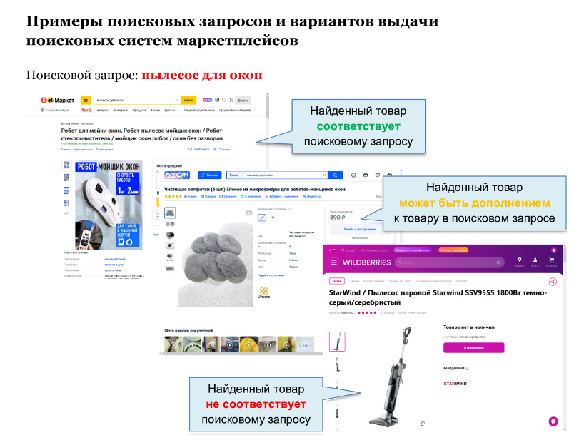 Для проверки качества поиска внутри маркетплейсов были составлены тестовые запросы, которые отвечали ряду критериев.