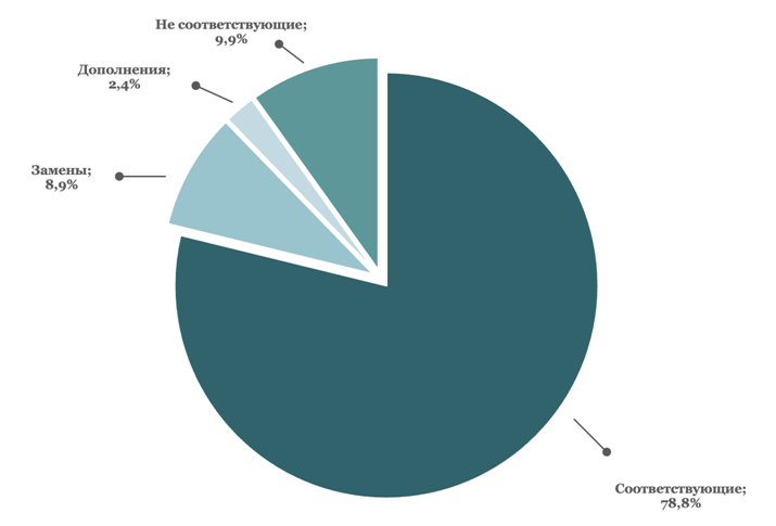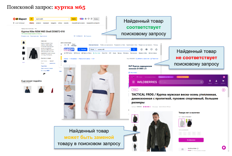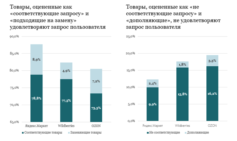 Респондентам предлагалось оценить пять первых товаров, которые предлагает каждая площадка в ответ на тестовый запрос. Шкала оценки содержала четыре категории: товар полностью соответствует запросу; товар может заменить товар из запроса; дополнение к товару из запроса; товар не соответствует запросу.
