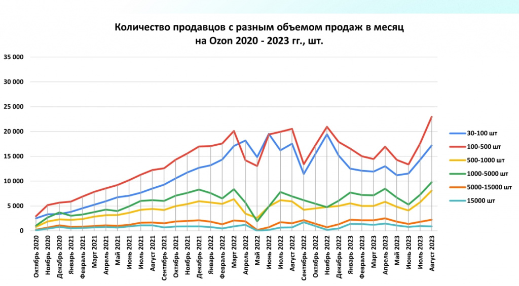 На Ozon, по словам Сергеева, картина противоположная: большое внимание к онбордингу новых селлеров даёт их постоянный рост, тогда как крупные селлеры и по количеству и по среднему обороту остаются примерно на одном уровне в течение года. На обоих маркетплейсах у подавляющего большинства продавцов меньше 100 продаж в месяц. И внутри этой когорты средний оборот приблизительно равен 30 тыс. рублей в месяц, с тенденцией к снижению.