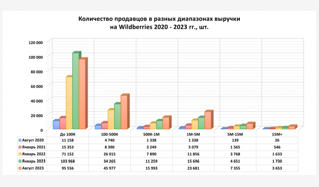 "На основе имеющихся у нас данных можем сделать вывод, что на Wildberries новичкам по разным причинам сложнее развиваться. Количество селлеров, делающих до 100 продаж в месяц держится примерно на одном уровне уже почти год. При этом, продавцы с оборотом 15+ млн в месяц активно растут. Следовательно, рост оборота Wildberries очень сильно зависит от самых крупных селлеров", - рассказывает Алексей Сергеев, руководитель Shopstat.ru.