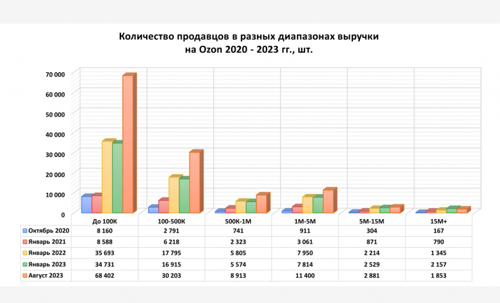 Второе место по популярности - у маркетплейса Ozon. Data Insight приводит данные самой площадки, согласно которым на Ozon работает около 120 тысяч. Настоящее исследование выявило на Ozon 123 652 активных продавца. Процент миллионеров на Ozon ниже, чем на Wildberries - от общего количества активных продавцов селлеров с оборотом более 1 млн рублей в месяц всего 13,05%.