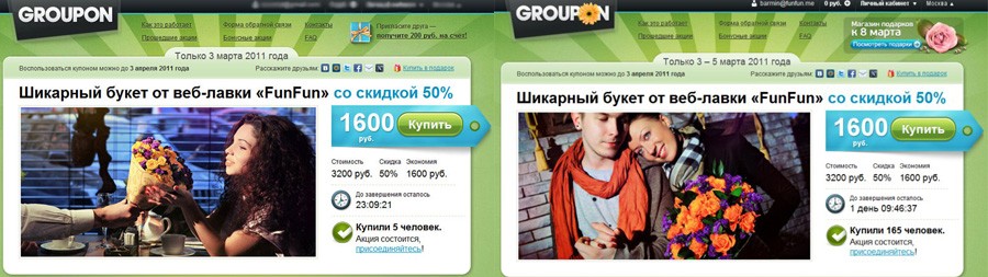 Главным прорывом нашего первого 8 марта должен был стать совместный проект ФанФана с купонным сервисом Дарберри, он же Групон. По подсчетам менеджеров Групона мы могли продать не менее 1500 - 2000 букетов, если анонсировать акцию 5-7 марта. И, что самое приятное, около 2 000 000 посетителей сайта должны были узнать о нас!
